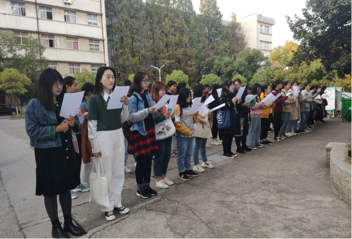 晨读前,2019级学生分发朗诵材料,组织新生井然有序的站队。而此次负责领读的许源航同学,用她抑扬顿挫的声音向我们展示了语言的魅力与风采。晨读时,新生们满怀激情,铿锵有力的读书声此起彼伏,在冉冉升起的朝阳下,展现着他们独有的少年意气。