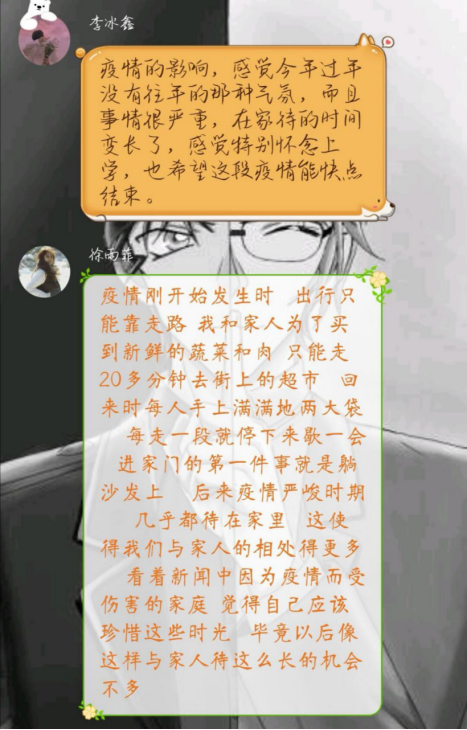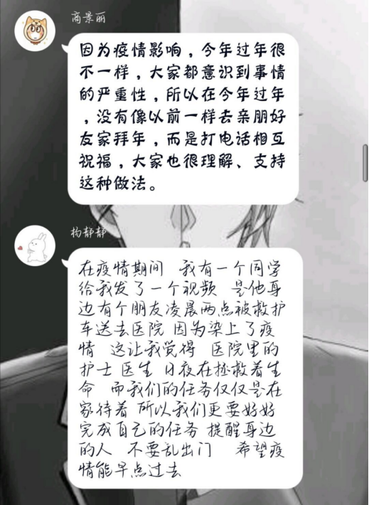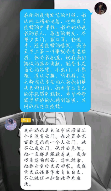 而这些故事也深深打动着我们,如身在武汉的王崴司同学,在确诊人数急增、志愿者急缺的情况下,自愿加入了社区志愿者队伍帮助抗击疫情,挨家挨户登记需求物资,定时测量体温,并将自己不多的零花钱捐出,提供给一线人员购买防护物资。还有连家郡同学,在听说社区招收志愿者时,拉上自己的小伙伴积极报名,当天下午便去社区帮助工作人员进行疫情期间的人口调查和人口信息统计,之后的每一天都是从早忙到晚,他说“尽管很累,但是能为社区做一些力所能及的事情远比在家虚度光阴更有意义。”