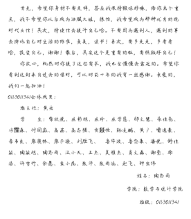 “老师的教导永远铭记在心,同学的笑声依然回荡耳边。疫情使我们不能做毕业的别离,但我们的心永远会在一起。希望我们341班的老师同学们都能乘风破浪,在未来的高点再次相遇,弥补毕业的遗憾!”