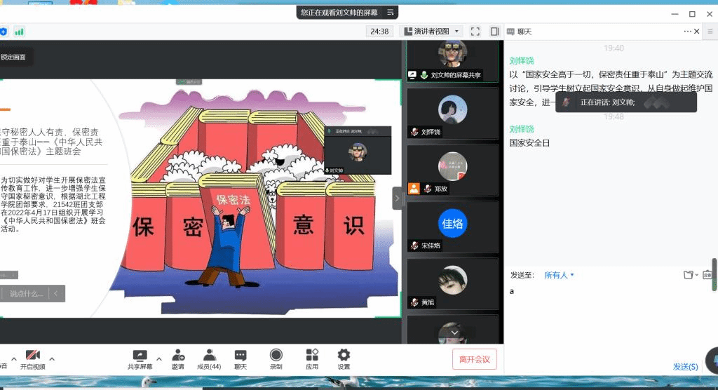 国家安全是头等大事!在“4·15国家安全教育日”来临之际,数统学院学子通过召开主题班会等形式,组织开展2022年国家安全教育日主题团日活动,切实增强同学们的国家安全意识。