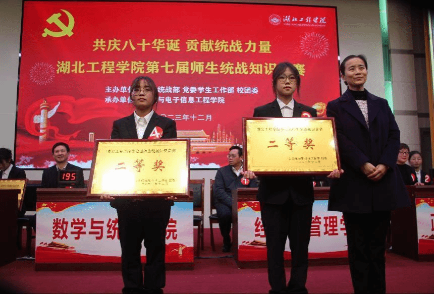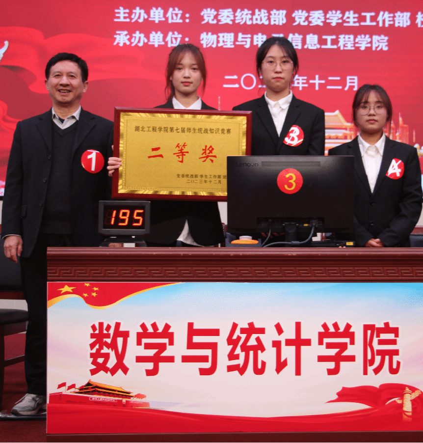 数统学院参赛队在分组比赛中以小组第一进入决赛,代表队成员分别是胡付高老师、王桂婷、汤群以及石佳雪三位同学。他们在决赛中展现出了良好的精神风貌和专业素养,凭借扎实的专业知识,准确、迅速地回答了比赛题目,赢得了评委和观众的一致好评。经过激烈的角逐,开元官网代表队凭借扎实的专业知识和出色的团队协作,成功获得了二等奖的优异成绩,党委书记卢雪梅为开元官网选手颁奖。