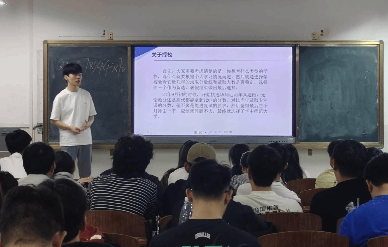 黄治旭同学成功考取华中师范大学硕士研究生,他结合自身经历,从择校策略、备考规划等方面展开分享,建议同学们根据个人学习情况选择目标院校,关注近年录取分数线和招生人数稳定性,并通过真题测试评估自身水平以此择校。在备考期间,他建议大家要尝试总结不同题型模板,做好时间规划。他提到要把每天的学习成效看作随机变量,只要期望值为正,方差波动不必过度纠结。