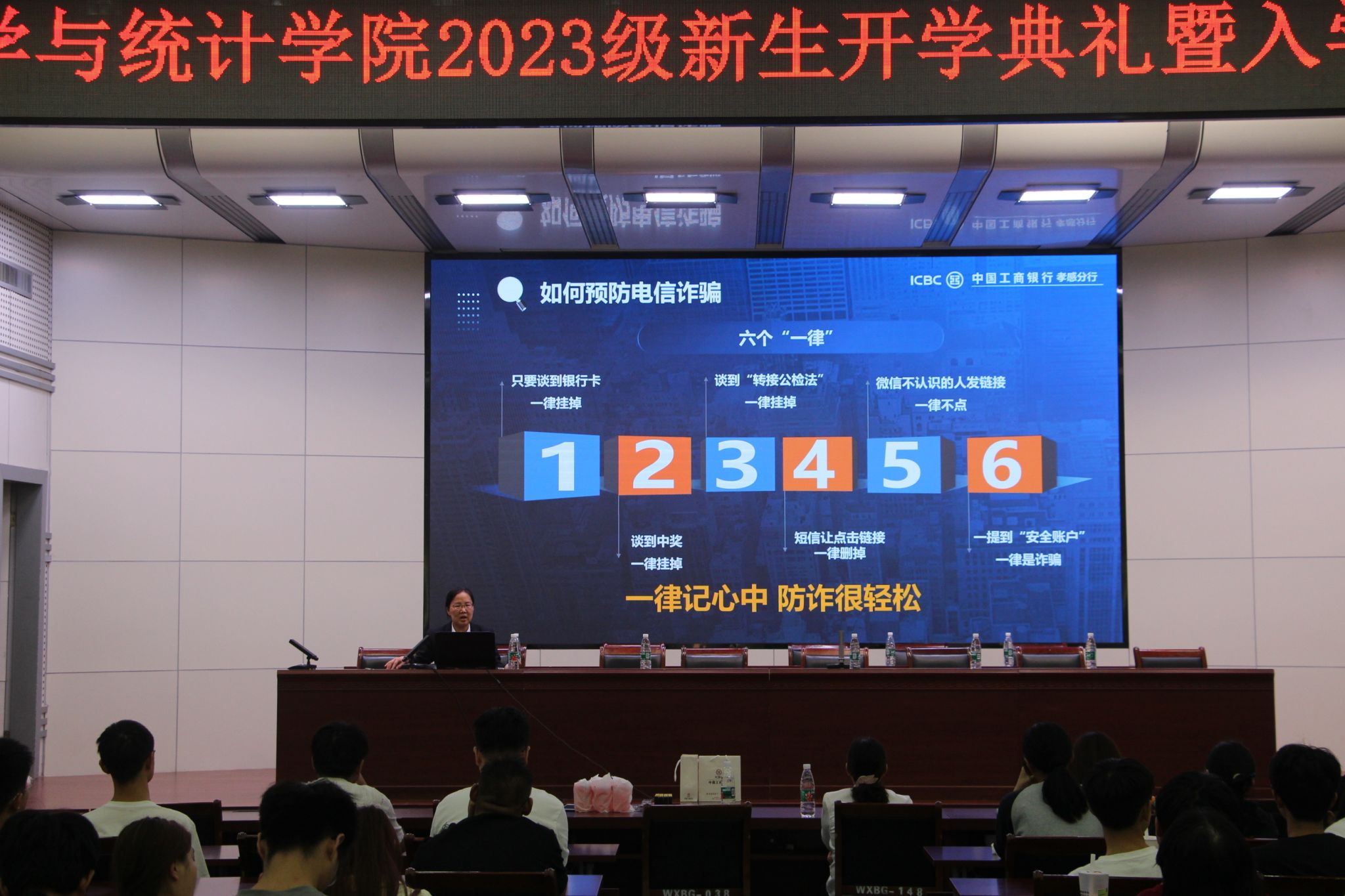 开学典礼结束后,副院长潘保国、党委副书记尹洁分别就学校学籍管理制度、学生管理规定等方面对全体新生进行了入学教育工作;团委书记郑放对学院党员发展、团员管理、学生第二课堂活动、学生干部管理等方面为新生进行了介绍,院学生会组织部长平淑琴同学为新生讲解了青年大学习的操作流程;本次入学教育还邀请了市工行肖红经理为新生上了一堂精彩的反电信诈骗安全宣讲课。
