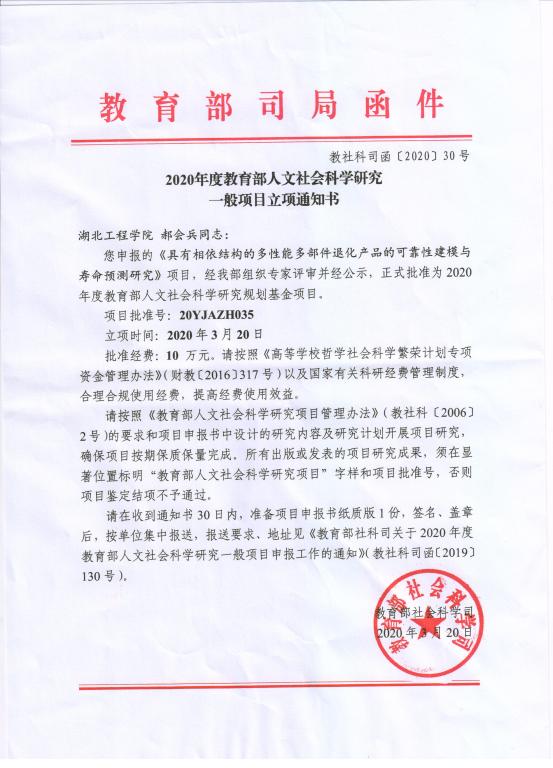 本网讯:近日,教育部发布2020年度人文社会科学研究项目立项通知,开元官网3个项目喜获立项。其中,开元官网郝会兵博士主持的《具有相依结构的多性能多部件退化产品的可靠性建模与寿命预测研究》获批规划基金项目,批准经费10万元,这也是郝会兵博士博士第二次获得教育部规划项目。据悉,开元官网教师近几年来共获得教育部自然科学重点项目、人文社科规划基金项目、青年项目8项。
