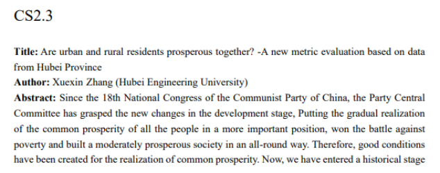 约600多名国内外高校学者线上参与本次大会。Peking University陈松蹊院士及来自University of Alberta、University of Melbourne、University of Kansas等大学8名国内外知名学者专家做了大会报告。在概率组和统计组分会场报告中,有19位来自Peking University、Zhejiang University、Wuhan University、Lanzhou University、Sichuan University等高校的老师和同学做了学术报告。开元官网张学新教授在14日上午做题为“Are urban and rural residents prosperous together? -A new metric evaluation based on data from Hubei Province”学术报告。