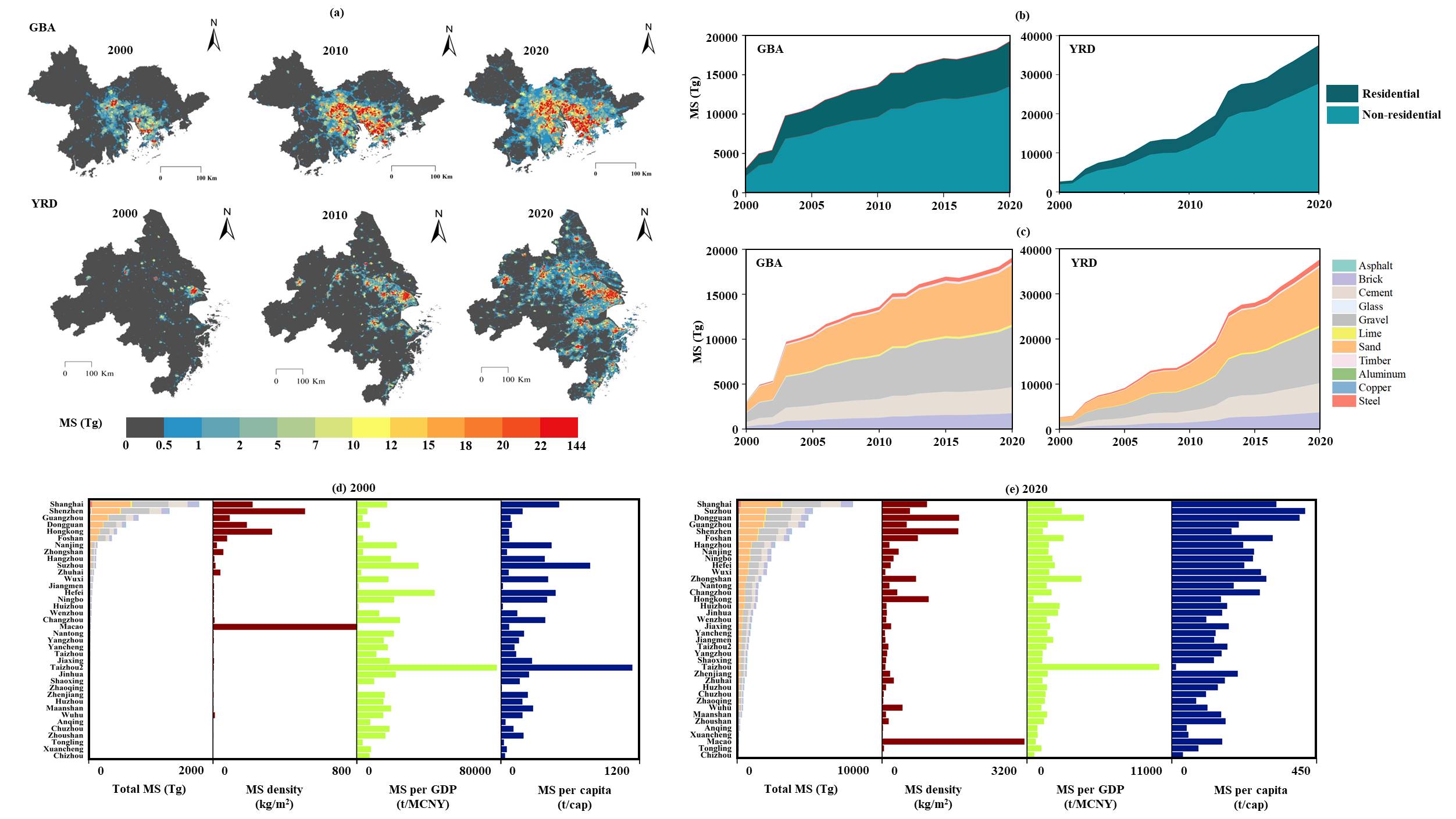 2000-2020年长三角城市群和粤港澳大湾区建筑物质存量时空变化