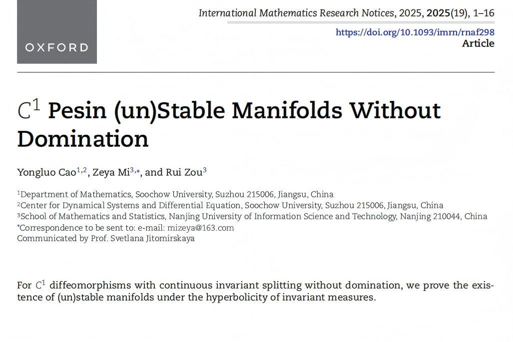 数统院教师糜泽亚、邹瑞与合作者在IMRN上发表C^1无控制分解系统上稳定流形研究成果