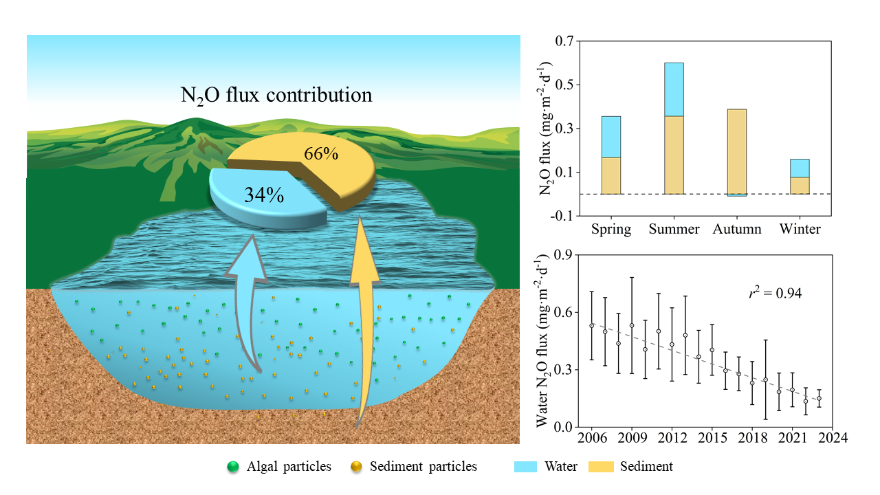 研究发现,太湖超30%的N2O是产自上覆水体中的,部分季节甚至高达50%以上。本研究还通过构建N2O排放通量与关键环境因子定量关系,估算了太湖上覆水N2O的历史排放量及其时空变化特征。结果表明,在湖泊治理政策管控下,太湖水体N2O排放量呈现大幅下降趋势。研究结论打破传统N2O来自厌氧沉积物的观点,为湖泊氮循环过程提供新视角,也为优化浅水湖泊N2O排放溯源提供了理论基础。