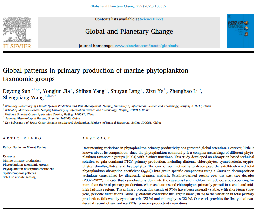 近日,伟德官网海洋遥感团队孙德勇教授课题组在海洋浮游植物类群初级生产力遥感领域取得新进展。研究成果以《Global patterns in primary production of marine phytoplankton taxonomic groups》为题发表于地球科学领域顶级期刊《Global and Planetary Change》(中科院一区Top)。第一作者为孙德勇教授,合作者包括伟德官网王胜强教授、国家卫星海洋应用中心贾永君研究员、2020级硕士研究生杨诗晗、国家卫星海洋应用中心郎姝燕副研究员、2025级博士研究生叶子绪和2021级博士研究生李正浩。伟德官网气候系统预测与变化应对全国重点实验室为第一单位。