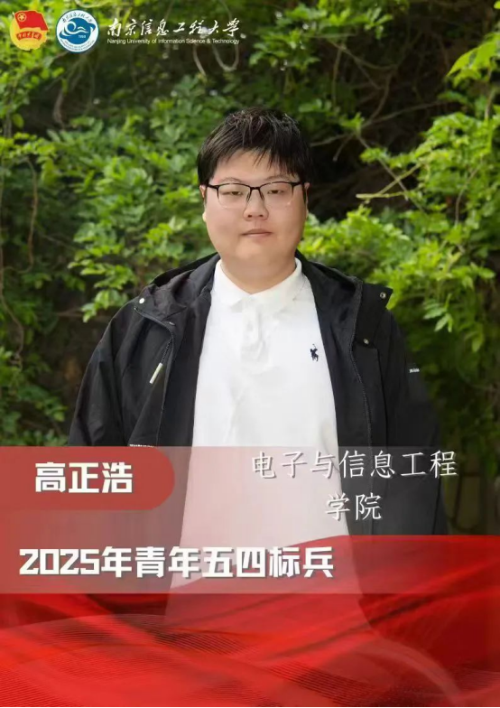 高正浩,中共预备党员,2022级电子信息工程中移物联产业班班长,曾任校电子工程师协会部长,电信院科协副主席。他学习成绩优异,综测分数专业第一。他秉持锐意创新,勤奋科研的精神,主持国家级大创、中科院大创各一项,基于项目申请国家发明专利16项,发表SCI论文3篇,并转化科创相关成果参加竞赛,获“挑战杯”全国大学生课外学术科技作品竞赛国家特等奖,中国国际大学生创新大赛(2024)全国银奖等奖项。他日常积极参加公共活动与志愿服务,第二课堂学分近300分。综合表现突出,获评国家奖学金、校三好学生标兵、校优秀班干部等荣誉。